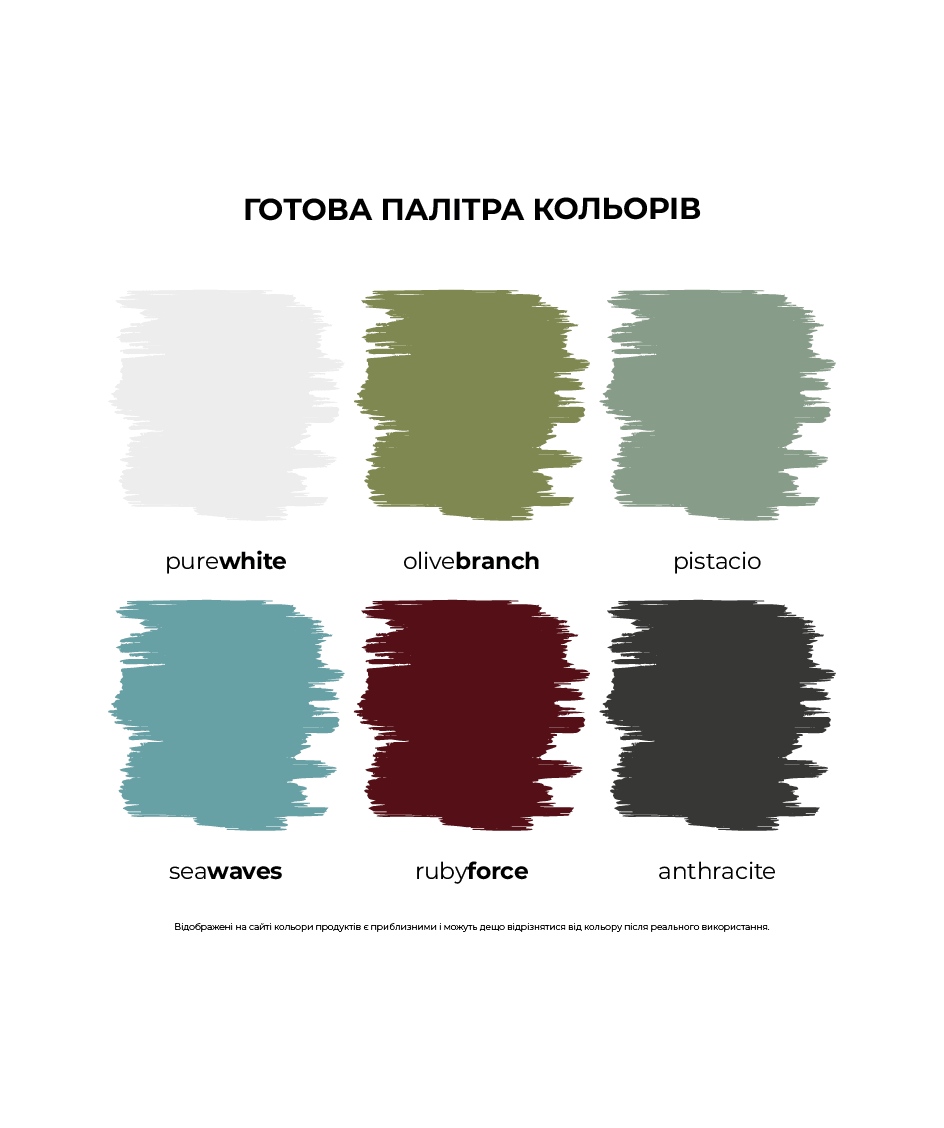 Багата палітра кольорів: Chalk-it можна обрати в готовому кольорі, або створити власний колір за допомогою барвників. Фарбу Chalk-it різних кольорів можна змішувати між собою, висвітлювати (додаючи фарбу в кольорі PureWhite), затемнювати (додаючи фарбу в кольорі Anthracite), таким чином створювати власні неповторні кольорові рішення.