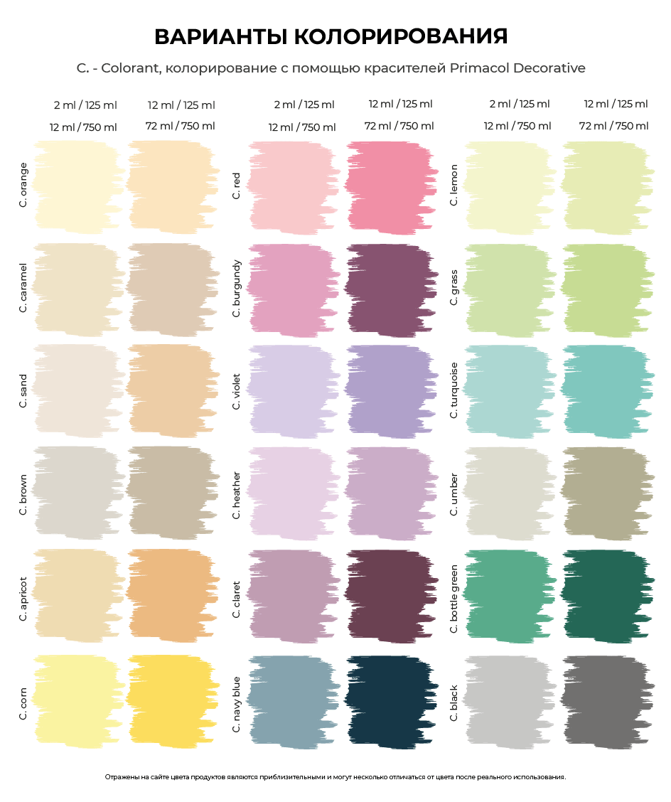 Богатая палитра цветов: Chalk-it можно тонировать согласно рецептур, или создать собственный цвет с помощью красителей. Краску Chalk-it (База – Pure White) разных цветов можно смешивать между собой, затемнять (добавляя краску в цвете Anthracite) или сделать тон светлее (добавляя краску в цвете PureWhite), таким образом создавать собственные неповторимые цветовые решения.